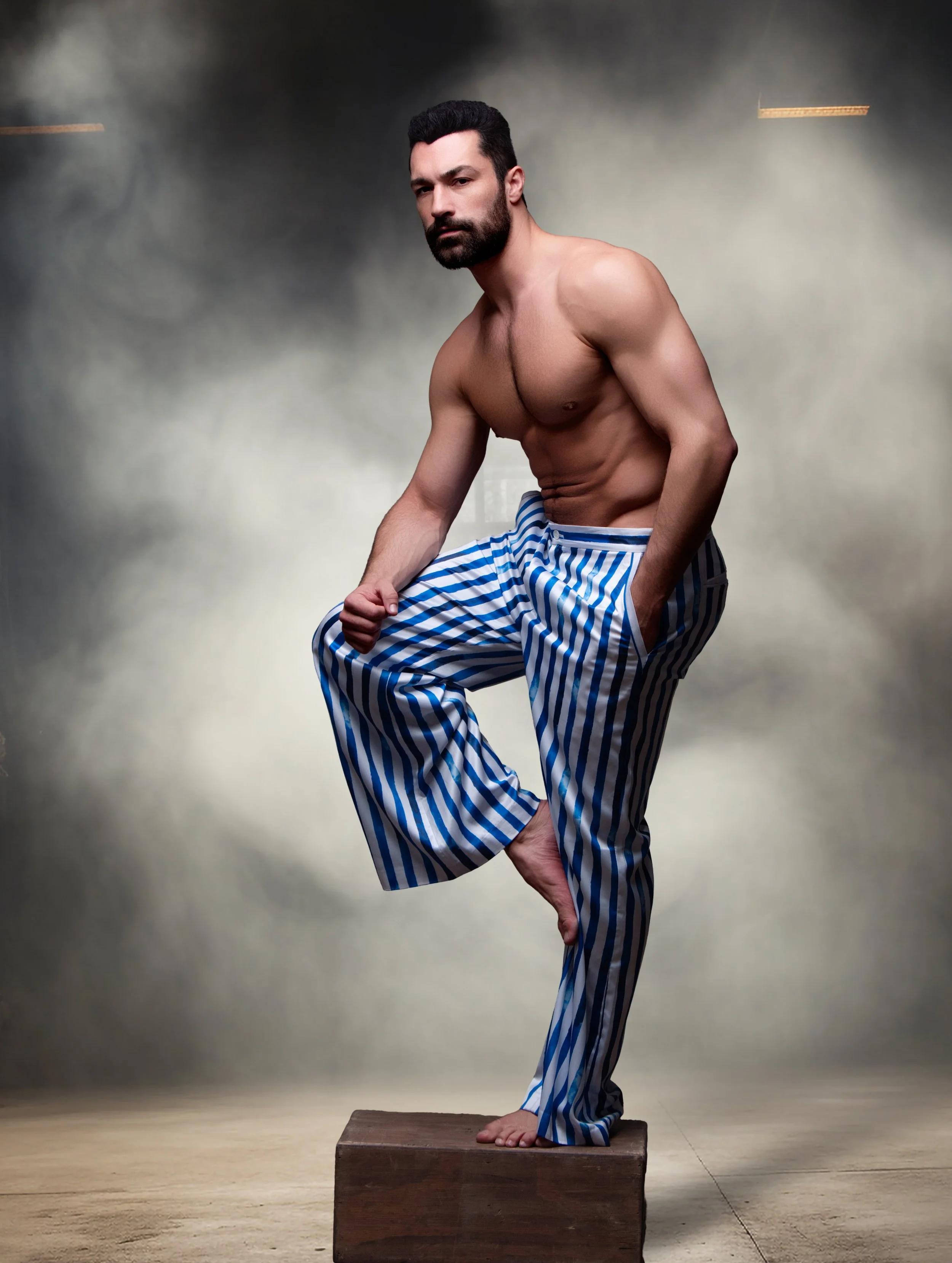 A muscular man with a beard and short hair shirtless, wearing striped pajama pants, standing on a wooden block in a foggy atmosphere with clouds and a window in the background.