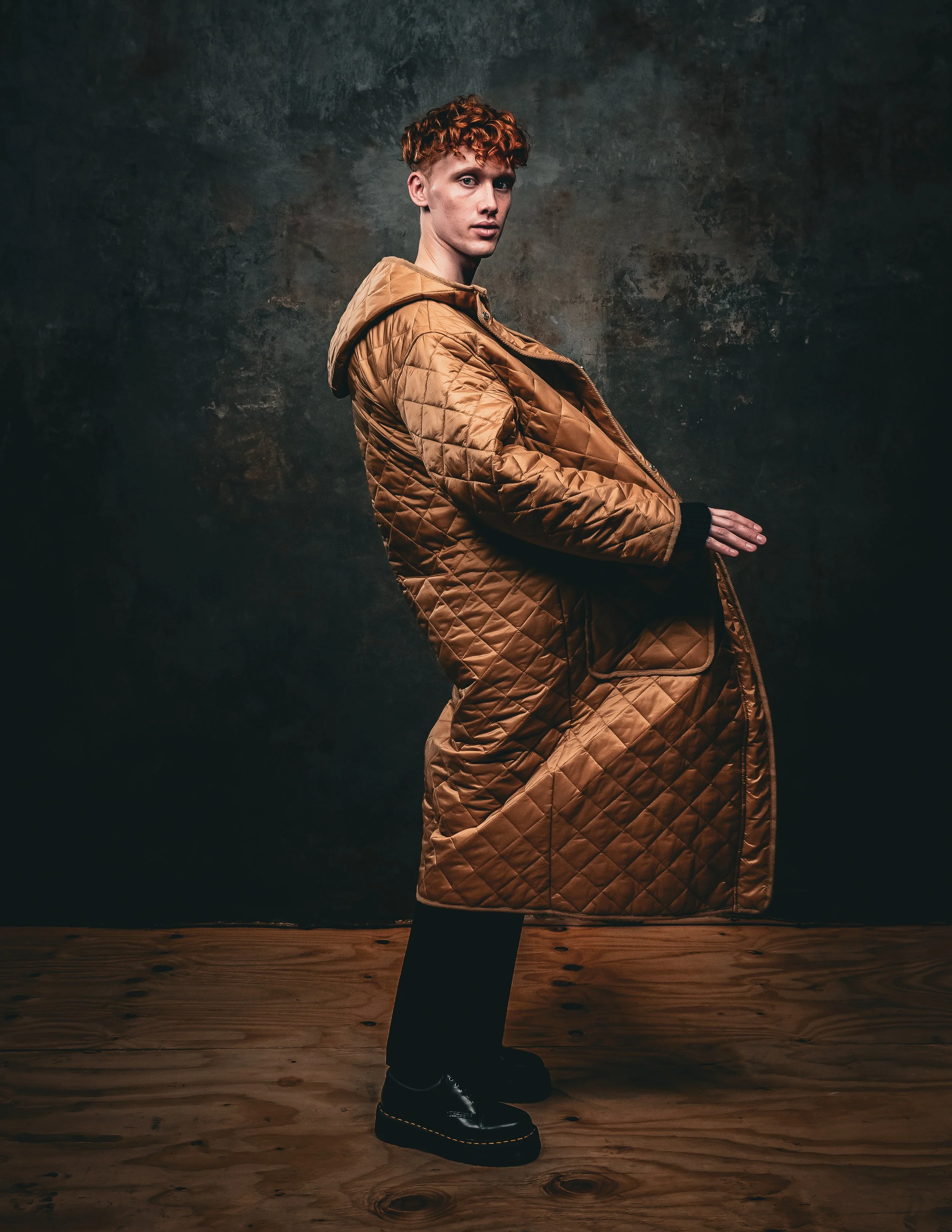 Young man with curly red hair wearing a tan quilted coat and black shoes standing against a dark textured background.